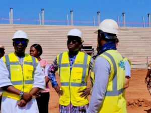 Sur le site, la délégation a constaté l’évolution des travaux au niveau de la tribune officielle, les bureaux, les gradins, les projecteurs de lumière, l’emprise du stade et l’ensemble des travaux en cours. À ce jour, les travaux réalisés par l’entreprise turque Integral Group, affiche un taux d’exécution de 72 %, et ce, conformément au calendrier établi.